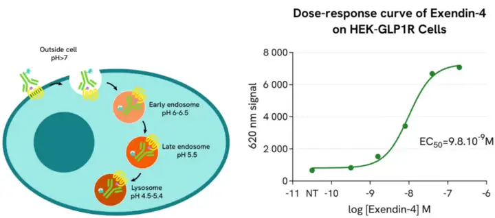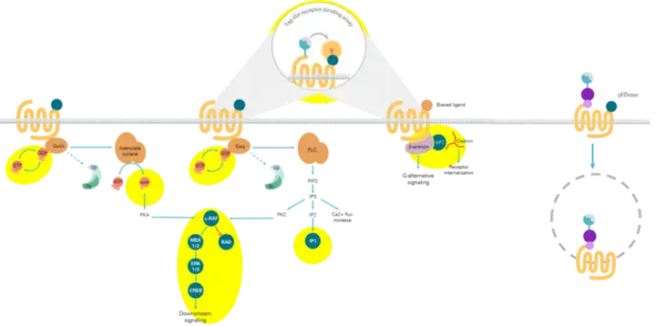 应用场景:受体内吞是GPCR信号“脱敏”和“复位”的关键步骤。当GPCR被长时间或过度激活后,会通过内吞作用从细胞膜上转移至细胞内部,从而终止其对细胞外信号的响应。利用GPCR内吞检测技术,可以实时或终点监测这一动态过程,这对于评估受体功能的持久性、药物脱敏效应以及某些通过内吞发挥作用的特定疗法(如靶向受体降解技术)至关重要。(链接ADC推文)