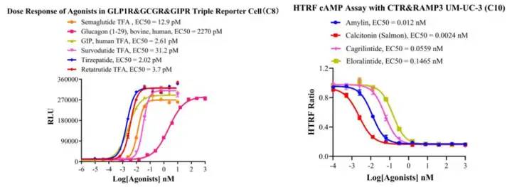 图2. 报告基因检测(左)与HTRF cAMP检测(右)数据展示