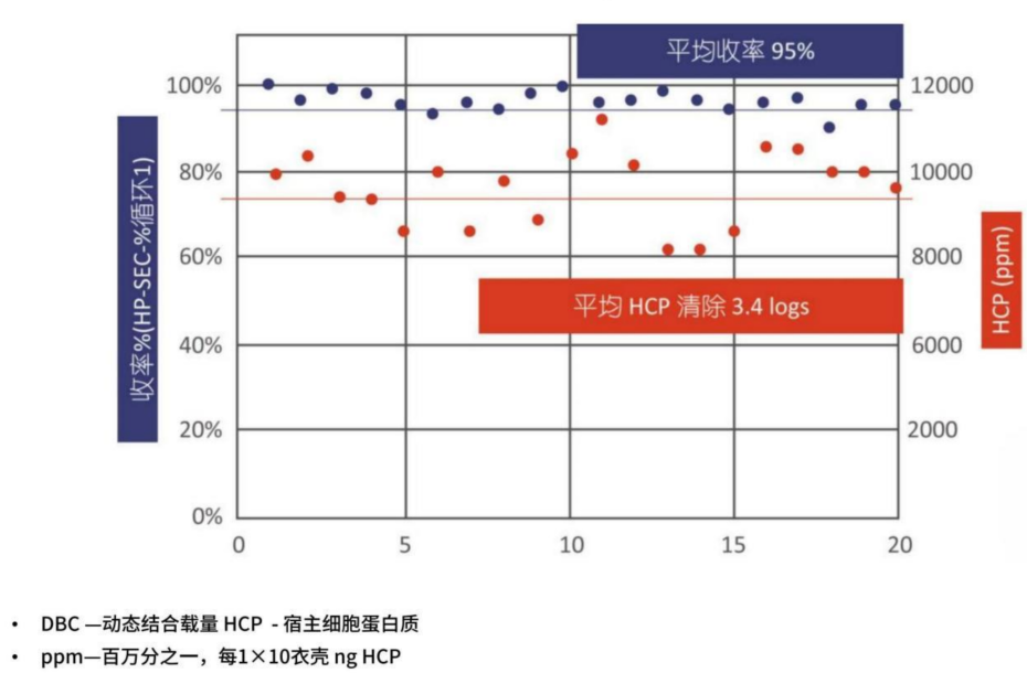 使用含有 AAV衣壳的 HEK293 浓缩澄清细胞培养液,进行结合、漂洗、洗脱和 CIP循环20次。CIP 包括使用 0.5M NaOH 保持30min的步骤。在20个循环中,平均收率为95%,平均 HCP 清除为3.4logs。