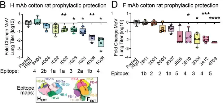 La Jolla免疫研究所Erica Ollmann Saphire团队9月15日在 bioRxiv 发布的最新预印本,首次从一名接种 MMR 逾50年的健康捐赠者体内,分离到100余株全人源麻疹中和单抗,并解析了17 株代表性抗体的高分辨结构,直接锁定 9 大保守表位。研究同时证明,单次低剂量(1 mg/kg)预防性给予其中 4 株抗体即可在棉鼠(Sigmodon hispidus)肺内将病毒载量降低 50–200 倍,其中最优抗体 4F09 更是把病毒载量降到检测限以下。