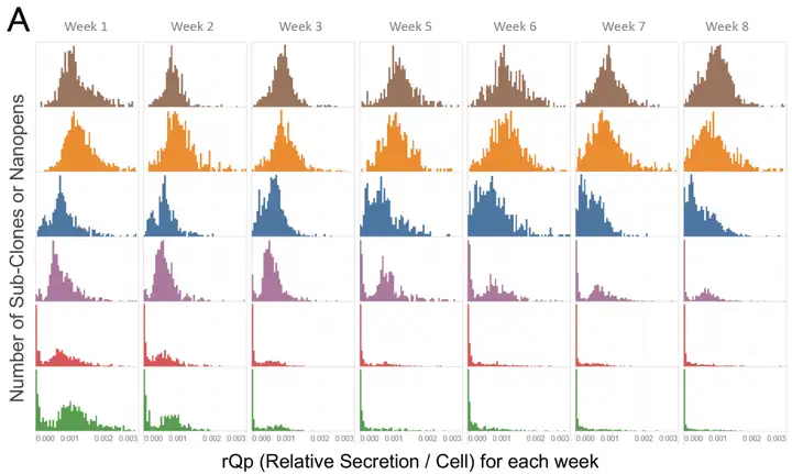 图1.与第一三共合作进行的Population Dynamics工作流程,用于评估六个CHO克隆的稳定性。每一行显示亚克隆生产力的分布,列代表在Beacon®平台上每周的测量结果。稳定克隆保持一致的分布,而不稳定克隆——例如以蓝色突出显示的克隆3——随着时间推移,低产亚群竞争胜过高产亚群而表现出分布变化。Beacon®的Assay Analyzer软件使用这些数据预测每个克隆的稳定性谱。* 注意:通常只收集单周的测量数据,这项为期8周的研究是为了验证预测算法而进行的。