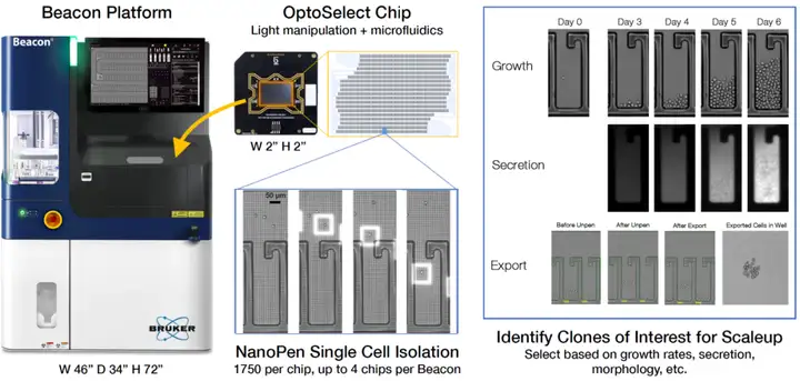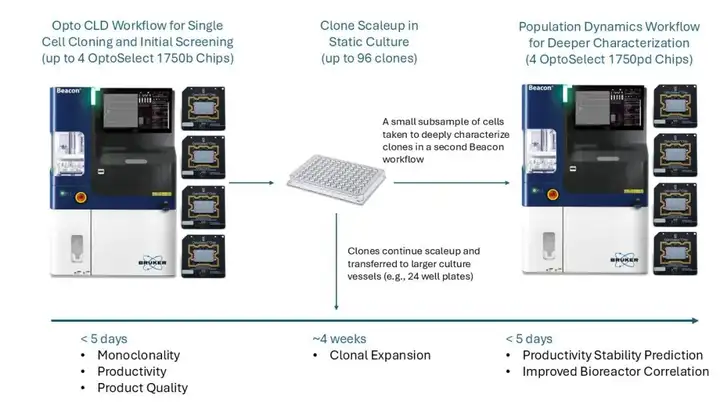 图2. 主要Opto CLD工作流程和次要Population Dynamics工作流程图。Opto CLD工作流程从转染的细胞池开始,然后进行单细胞克隆以及初步的生产力和质量表征。表现最佳的克隆以96孔板形式导出并放大培养约四周。在此期间,所选克隆的子样本被重新引入Beacon®系统进行Population Dynamics分析。基于这些结果,用户可以重新确定优先级或淘汰低价值克隆,从而通过将资源集中在最有希望的候选克隆上来降低放大成本。通过结合深度克隆表型分析、高通量工作流程和易于接受的成本,配备Population Dynamics分析功能的Opto CLD试剂盒为细胞系开发的每个阶段带来了更高水平的洞察力。应用场景包括:稳定性预测:提前识别那些“隐藏不稳定因素”的克隆,检测可能导致未来滴度不稳定的行为。克隆重新排序:使用高重复性数据根据生产力重新排序克隆,改善与生物反应器结果的相关性,正如先前在基于CHO和基于酵母[5]的生产系统中已证明的那样。细胞池阶段风险降低:利用OptoSelect®芯片评估转染策略在细胞池阶段的表现,在开发早期识别有希望的候选者。03立即行动变革您的CLD工作流程!是时候告别克隆选择的“赌博”,迈向数据驱动的精准决策了。Opto™ CLD with Population Dynamics Kit助您: