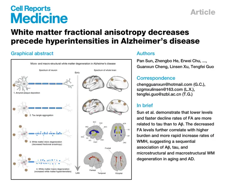 阿尔茨海默病(Alzheimer's Disease, AD)是一种神经退行性疾病,其病理特征包括β-淀粉样蛋白(Aβ)斑块和tau蛋白缠结的积累。近年来,研究表明白质(White Matter, WM)退化在AD进程中扮演关键角色,但微结构(如分数各向异性, Fractional Anisotropy, FA)与宏观结构(如白质高信号, White Matter Hyperintensities, WMH)变化的时序关系及其与AD病理的关联尚不明确。文章通过多模态神经影像数据,揭示了tau蛋白聚集与微结构WM退化(FA降低)的紧密联系,且FA减少先于WMH增加,为AD早期诊断提供了新见解。Simoa单分子蛋白检测技术,以其超高灵敏度(比传统ELISA高1000倍),能够检测外周血中低丰度蛋白生物标志物(如Aβ、tau、GFAP等),为AD早期诊断提供技术支撑。