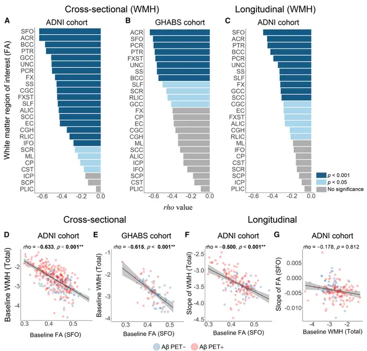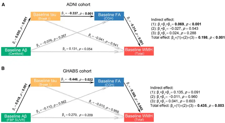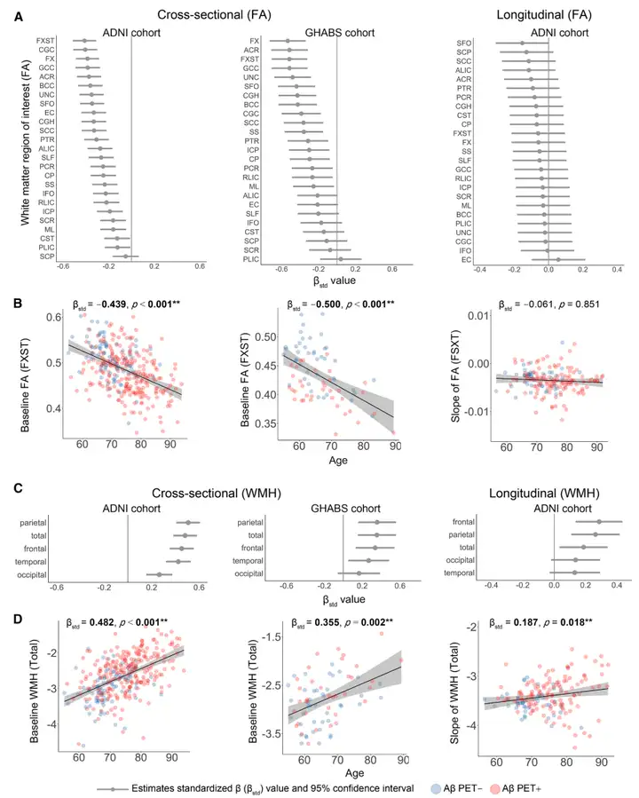基于阿尔茨海默病神经影像倡议(ADNI)和粤港澳大湾区健康老龄化脑研究(GHABS)两大队列,共纳入328名ADNI参与者和78名GHABS参与者,收集了基线及纵向的Aβ PET、tau PET、扩散磁共振成像(dMRI)和T2 FLAIR数据。研究通过广义线性模型(GLM)和线性混合效应模型(LME)分析FA和WMH与AD病理(Aβ和tau)、年龄、血管风险因素的关联,并依据修订的AD生物分期标准(A/T profiles)进行分组比较。实验设计强调了多模态数据的整合,Simoa技术可在此框架下用于验证血液生物标志物与影像发现的相关性。