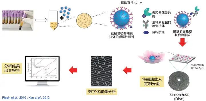 Simoa技术是由哈佛大学医学院David Walt教授开创的数字ELISA平台,其核心在于通过飞升级微孔(50 fL)实现单分子检测。技术流程包括:抗体偶联磁珠形成免疫复合物,磁珠落入微孔后,酶催化底物产生荧光信号,经CCD摄像头数字化分析。Simoa的灵敏度达到飞克级别(fg/mL),可直接检测血液中传统方法无法触及的蛋白标志物,如AD相关的tau、Aβ等。与传统ELISA相比,Simoa反应体积缩小20亿倍,避免了信号稀释,实现了真正的单分子检测。