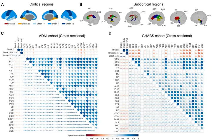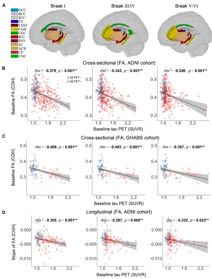 通过tau PET成像显示,Braak I-VI区域的tau标准摄取比值(SUVR)与多个WM脑区的FA水平呈负相关(如海马扣带回CGH、穹窿FX等),且纵向数据表明tau聚集加速了FA下降。这一发现提示tau蛋白是微结构WM退化的主要驱动因子。Simoa技术的高灵敏度可直接检测血液中的tau蛋白(如pTau-181、pTau-217),与PET数据形成互补。