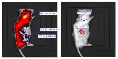 IVIS小动物活体成像仪能够通过信号的深度、位置,来计算和模拟小鼠三维模式下的荧光标记定位信息,更直观的表现出标记定位于何种器官或组织中。