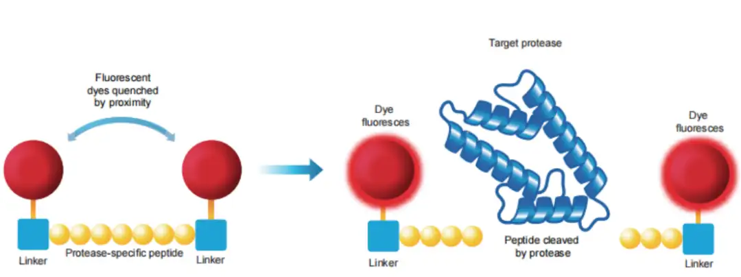 酶激活类探针本身处于光沉默状态,一旦被注入疾病模型体内,便会被疾病发展过程中特异性表达的蛋白酶识别剪切而激活,并在外界光源激发下产生发光现象。此类试剂能够监测疾病发展过程中特异性分子事件的发生,具备极高的信噪比。其中FAST 系列试剂基于新型小分子物质的结构设计,可提供更高的特异性及更快的激活性能,能够满足疾病早期快速成像的需求。