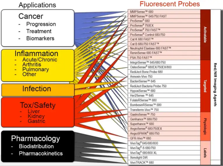 瑞孚迪(revvity)基于业内“金标准”的小动物活体成像系统,通过深耕客户应用场景,开发出性能优异、种类丰富的荧光探针。瑞孚迪荧光探针的荧光信号波长通常在近红外区间(680 nm和750 nm),近红外荧光探针通过解决活体成像中穿透深度和信噪比这两大核心瓶颈,使科研人员得以在活体动物体内实时、清晰地观测生理病理过程。