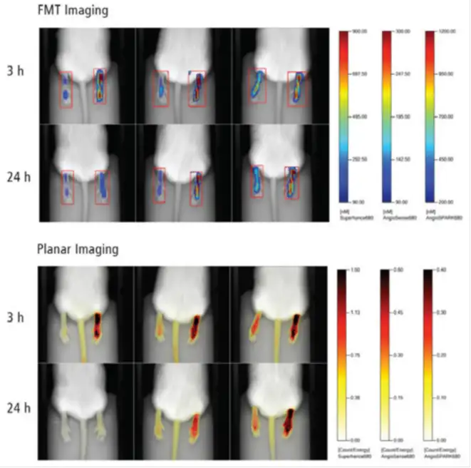 成像由角叉菜胶(carrageenan, CG)注射诱发急性中性粒细胞驱动的足肿胀。体层摄影和平面图像显示IVISense Edema 680、IVISense Vascular 680、IVISense Vascular NP 680三种不同血管荧光探针的荧光模式,这些血管荧光探针在引起炎症性水肿的右足积累。IVISense Edema 680在CG注射后2小时(t=2h)注射,而IVISense Vascular 680、IVISense Vascular NP 680在3小时(t=3h)注射,在足肿胀反应峰值(3小时)时成像,三种探针在注射CG的足部都显示出信号增强。 IVISense Edema 680在组织中快速代谢,使其成为急性水肿的理想成像探针。IVISense Vascular 680、IVISense Vascular NP 680在24小时都显著表现出炎症。