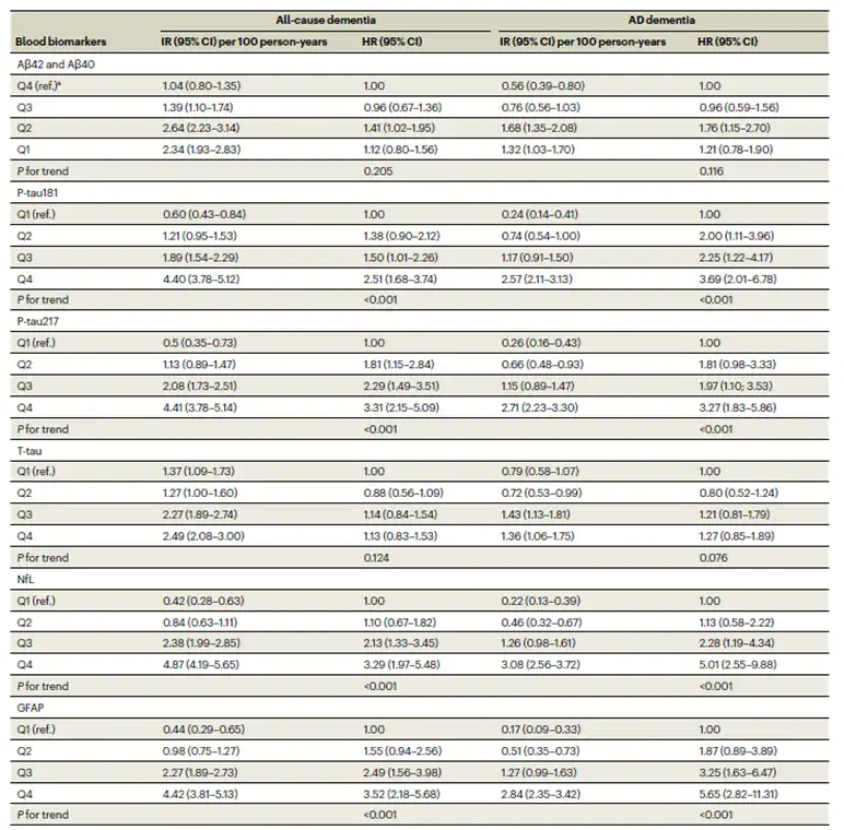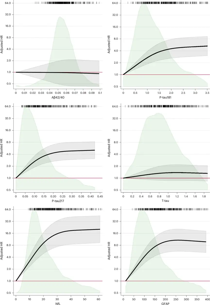 图2. 全因痴呆风险比与基线生物标志物水平的关联分析