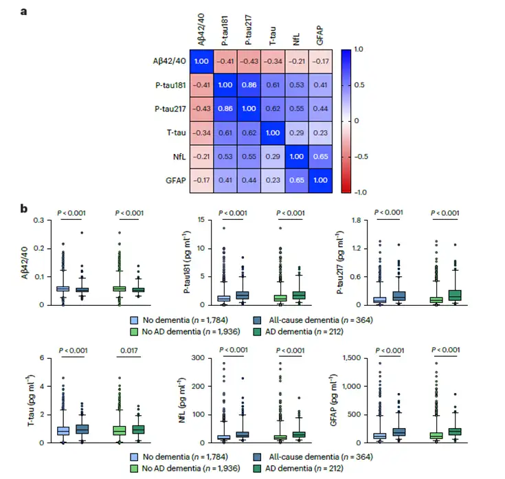 在长达16年的随访期间(中位随访时间10.2年),共识别出364例痴呆病例(发病率,1.82;95%置信区间)。其中,212例(58%)为AD痴呆(发病率,1.06;95%置信区间)。最终分析样本为2148名参与者(表1)。图1a 显示了所测生物标志物之间的斯皮尔曼相关性矩阵。所有生物标志物彼此相关。最强的相关性出现在p-tau217和p-tau181水平之间、NfL和GFAP水平之间、p-tau217和总tau水平之间等。图1b 显示了按偶发全因痴呆和AD痴呆分组的AD血液生物标志物的基线分布。总体而言,与未患痴呆的个体相比,最终患痴呆的个体基线淀粉样蛋白β42/40比值较低,而基线p-tau181、p-tau217、总tau、NfL和GFAP水平较高。