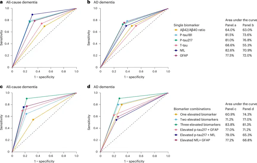 基于p-tau217、NfL和GFAP多种生物标志物水平升高来检测未来10年全因和AD痴呆的预测性能,对于全因痴呆的AUC值分别为60.9%、71.1%和83.8%,对于AD痴呆的AUC值分别为74.3%、77.0%和81.3%。当研究特定的生物标志物组合时:
