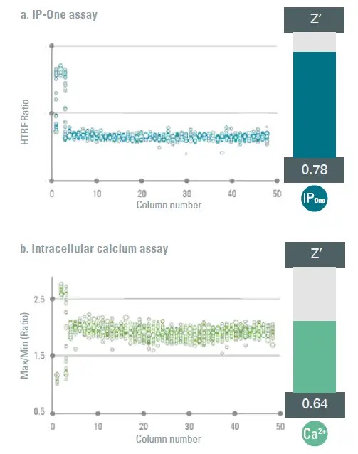 “Z”值是高通量筛选中测定稳健性的参数。下面案例研究中,IP1检测证明了卓越的检测质量,在每次运行中都能提供高稳健的“Z”值 (~0.78)。