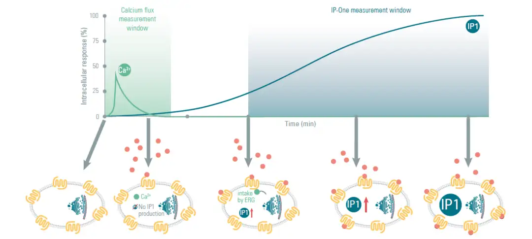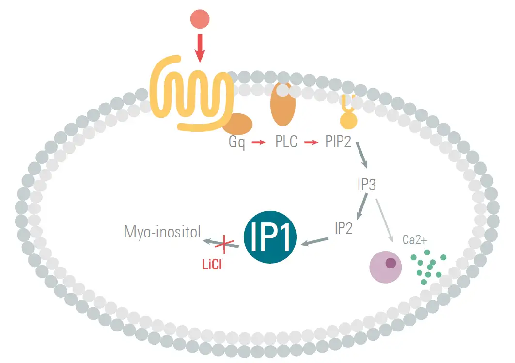 钙离子检测主要通过钙离子敏感荧光探针检测细胞内的钙释放;而IP1是IP3的转化产物之一, IP3的半衰期很短,其产生后在磷酸酶的作用下生成IP2,然后生成IP1,终产物为myo-肌醇。LiCl能够阻止IP1转化为myo-肌醇,当细胞内加入一定浓度的LiCl,可引起IP1的积聚。所以通过测定IP1的含量,可以用于评估Gq通路的活化程度。