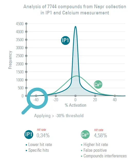 钙离子变化涉及多种信号通路,呈现瞬态和高度调节,是非平衡检测,钙离子检测会导致筛选结果存在偏差,出现假阴性,从而导致重要分子的丢失;而IP1的累积与刺激时间成正比关系,可记录每一个可能的Hit,包括慢效化合物。