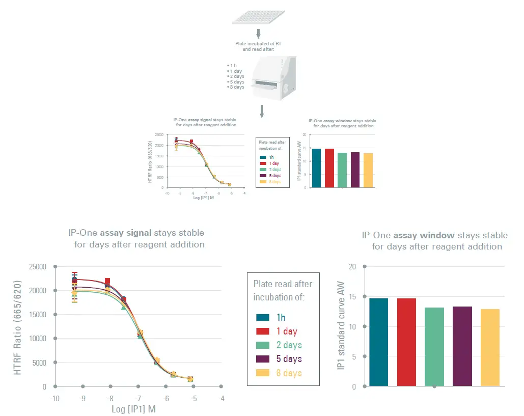 不稳定的信号意味着必须在添加试剂后立即读取板,这可能会降低通量。HTRF信号以及标准曲线测定窗口随着时间的推移保持稳定,表现出相同的性能。凭借稳定的信号,HTRF IP1检测可以防止可能出现的不可预见问题。
