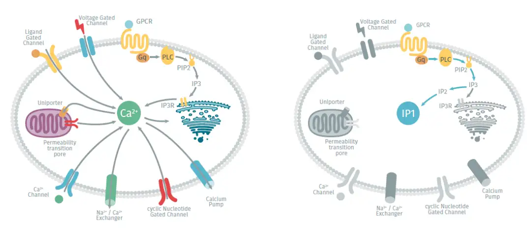 Gq通路是G蛋白介导的信号传导通路之一,其效应分子为磷脂酶C(PLC),当细胞外的信号分子与Gq受体结合后,激活细胞膜上的PLC,水解磷脂酰肌醇4,5-二磷酸(PIP2)为肌醇1,4,5-三磷酸(IP3)和二酰甘油(DAG)。IP3与滑面内质网和线粒体上的受体结合,钙通道活化,引起细胞内钙离子浓度升高(如Figure 3所示)。目前Gq通路检测主要有两种途径,分别测定细胞内Ca2+浓度或IP1含量的变化。