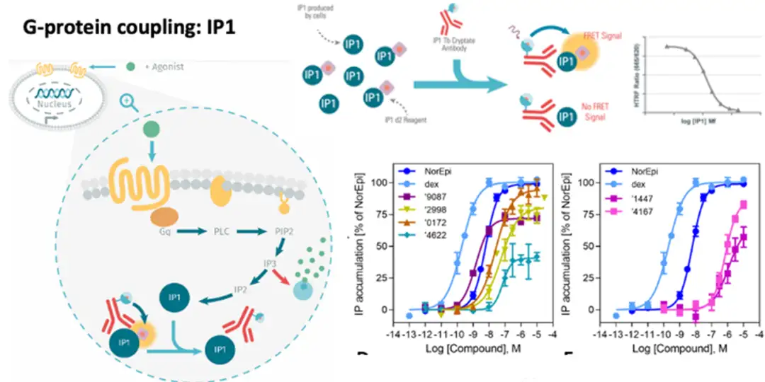 IP1仅由磷脂酶 (PLC) 作用产生,信号特异于Gq通路,而钙反应本质上是复杂的,钙离子的释放经常由非G蛋白机制触发(如Ca2+渗透通道、Ca2+泵和Ca2+转运蛋白),与这些受体结合的化合物被认为是“脱靶”的 (如Figure 4所示)。当有Ca2+载体和透化细胞膜相关的化合物用于激动剂筛选时,钙离子检测容易出现假阳性结果,而IP1可确保这些化合物不被检测到。