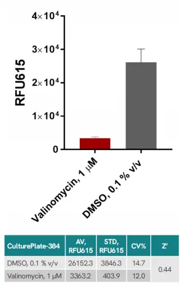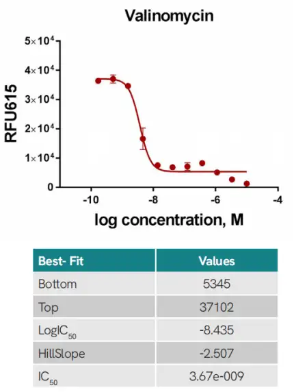 使用缬氨霉素(Valinomycin)作为阳性对照,测得IC50为3.67 nM,结果与文献报道一致。