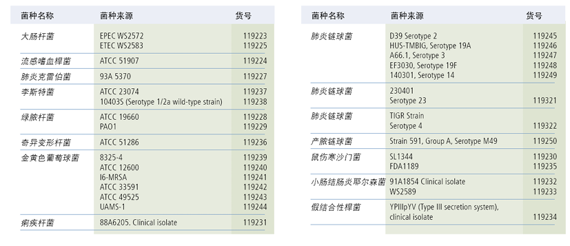 在观测细菌感染方面,研究者既可利用萤火虫荧光素酶基因、海肾荧光素酶基因等 常用于标记真核细胞的报告基因进行标记,也可利用从某些发光细菌中提取的lux发光 基因操纵子进行标记。后者的好处是,lux 操纵子中已含有表达荧光素酶及其底物的序 列,因此无需再外源注射底物即可成像。Revvity提供多种商业化的经细菌荧光素酶基 因标记的生物发光细菌菌种(如下图所示):
